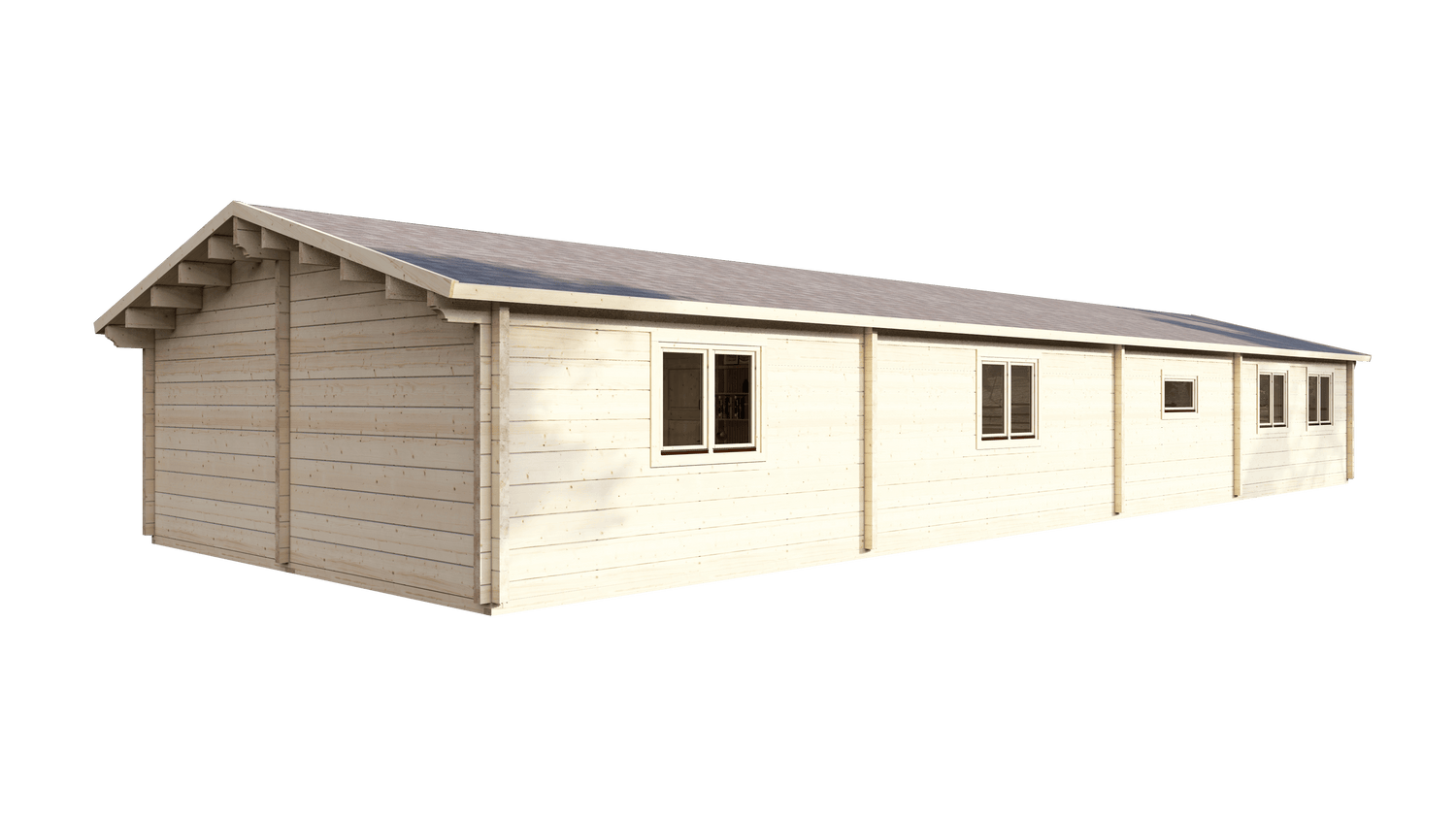 88mm Glulam Logs: Essential for a 20-metre structure, our laminated logs provide the structural rigidity required to prevent movement or warping over such a long span.